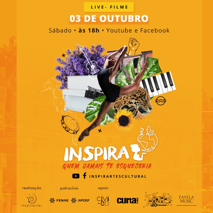 Dia 03 de outubro, sábado, às 18h, você é nosso convidado para assistirmos juntos a live-filme Inspira: Quem Jamais te Esqueceria. Um roteiro inspirador que envolve um diálogo entre grandes nomes da cultura brasileira com grandes talentos da comunidade de Paraisópolis. Ainda será abordado o tema sustentabilidade, empreendedorismo e a força feminina na comunidade.
