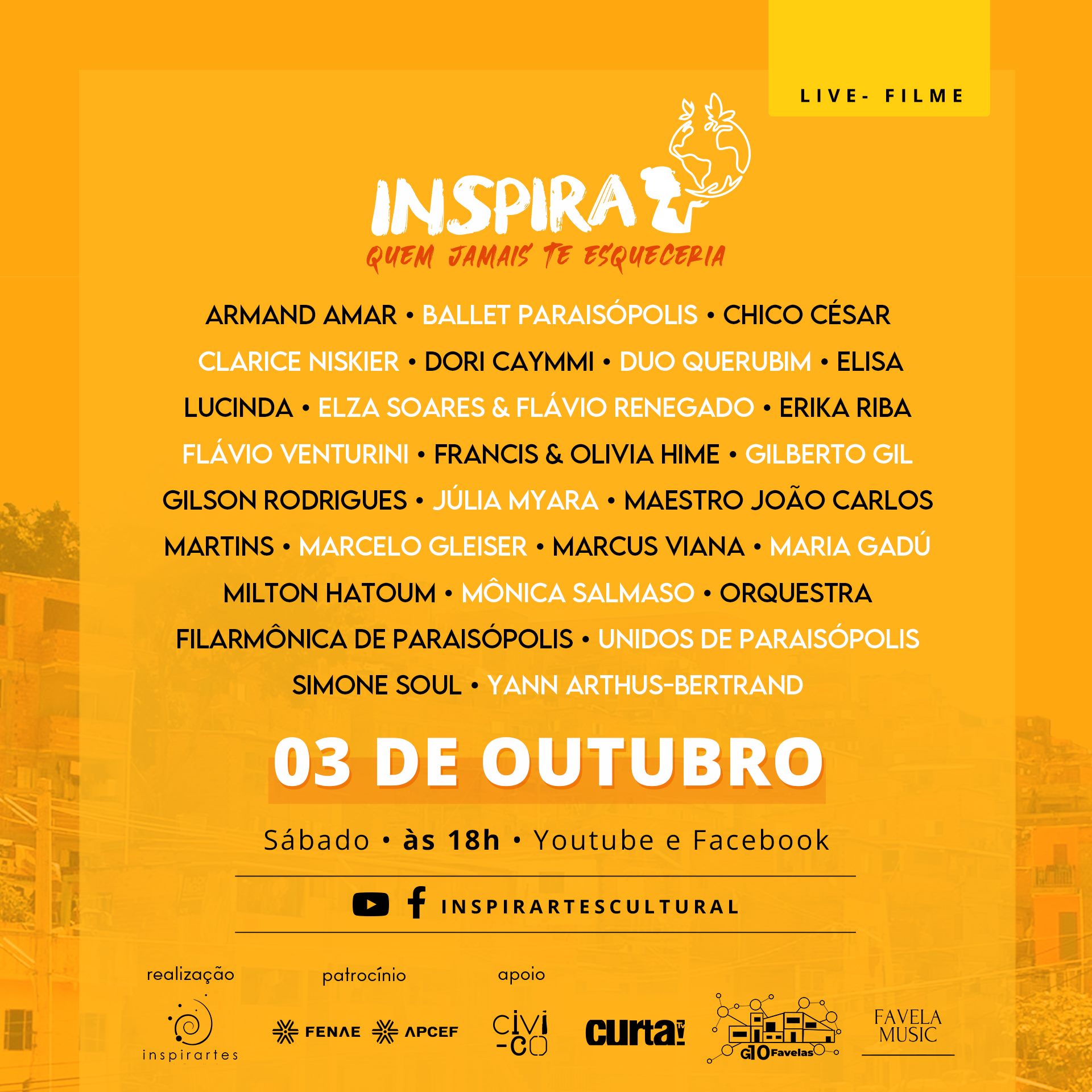 Mas não fazemos isso sozinhos! Nesta edição do Inspira: Quem Jamais te Esqueceria temos o privilégio de contar com a participação de grandes nomes como Armand Amar, Ballet Paraisópolis, Chico César, Clarice Niskier, Duo Querubim, Elisa Lucinda, Elza Soares & Flávio Renegado, Dori Caymmi, Erika Riba, Flávio Venturini, Francis & Olivia Hime, Gilberto Gil, Gilson Rodrigues, Júlia Myara, Maestro João Carlos Martins, Marcelo Gleiser, Marcus Viana, Maria Gadú, Milton Hatoum, Mônica Salmaso, Orquestra Filarmônica de Paraisópolis, Unidos de Paraisópolis, Simone Soul e Yann Arthus-Bertrand.
